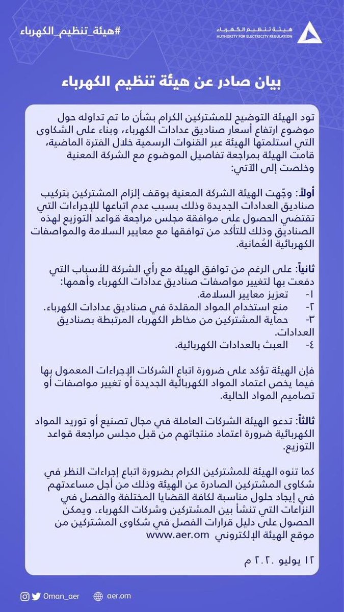 شبكة ع مان Oman Network Twitterren بعد تداول موضوع ارتفاع أسعار صناديق عدادات الكهرباء وجهت هيئة تنظيم الكهرباء الشركة المعنية بوقف إلزام المشتركين بتركيب صناديق العدادات الجديدة Https T Co Sfhafna0jh