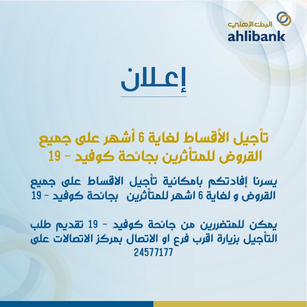 Ahli Bank البنك الأهلي Ar Twitter يسرنا إفادتكم بامكانية تأجيل الاقساط على جميع القروض ولغاية ٦ اشهر للمتأثرين بجائحة كوفيد ١٩ يمكن للمتضررين من جائحة كوفيد ١٩ تقديم طلب التأجيل بزيارة